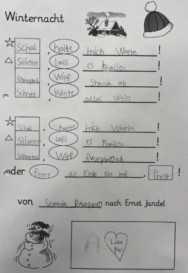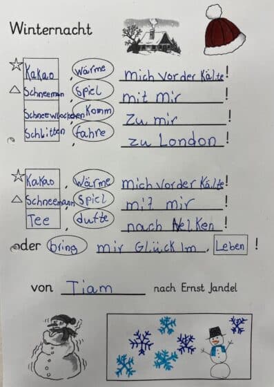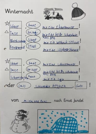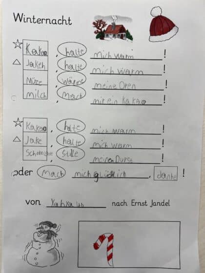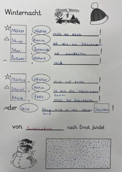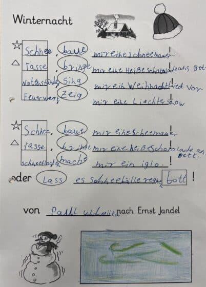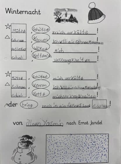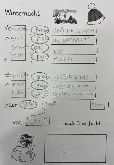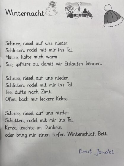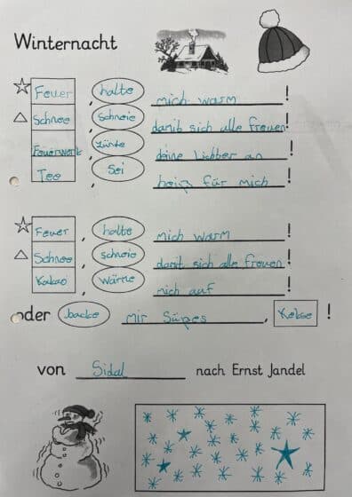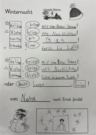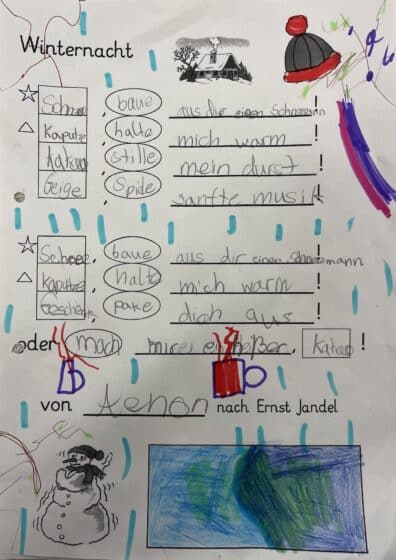 In DemeK lernen wir Gedichte kennen und untersuchen ihren sprachlichen Aufbau. Dann schreiben wir sie mit unseren eigenen Ideen um. Das Original ist das Gedicht Winternacht von Ernst Jandel. Die Kinder der Faultierklasse 4b hatten viele, tolle eigene Ideen.